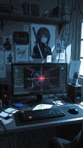 Dark Hacker-Themed Artwork with Red-Eyed Hooded Figure at Coding Desk